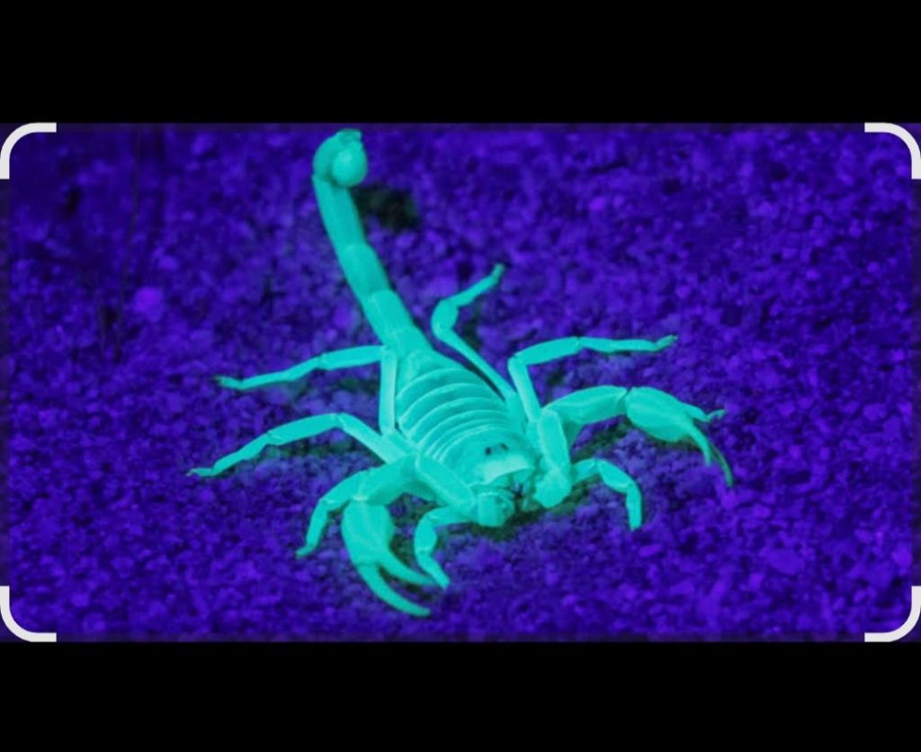 Voici justement le scorpion du désert, il était sur la trace du ténébrion, en définitive c’est notre ami qui lui a sauvé la vie, déclare le guide, car le scorpion passe son chemin. Ce scorpion mesure jusqu’à 15 centimètres et avec son venin il peut tuer des petits mammifères. Il possède de longs poils sensoriels qui recouvrent son corps, ce qui lui permet de détecter le moindre déplacement d’air, alors que ses pattes perçoivent les plus petites vibrations du sol. Comme nous effectuons cette visite par une nuit de pleine lune, d’où sûrement le cri de la souris sauterelle, voici que le scorpion devient fluorescent. Son exo-squelette absorbe les rayons ultra-violets et il les restitue sous la forme d’une couleur bleu vert.