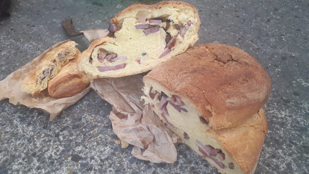 Acheté chez le « roi du folar », cette brioche salée de 2kg est garnie de lard et saucisses.