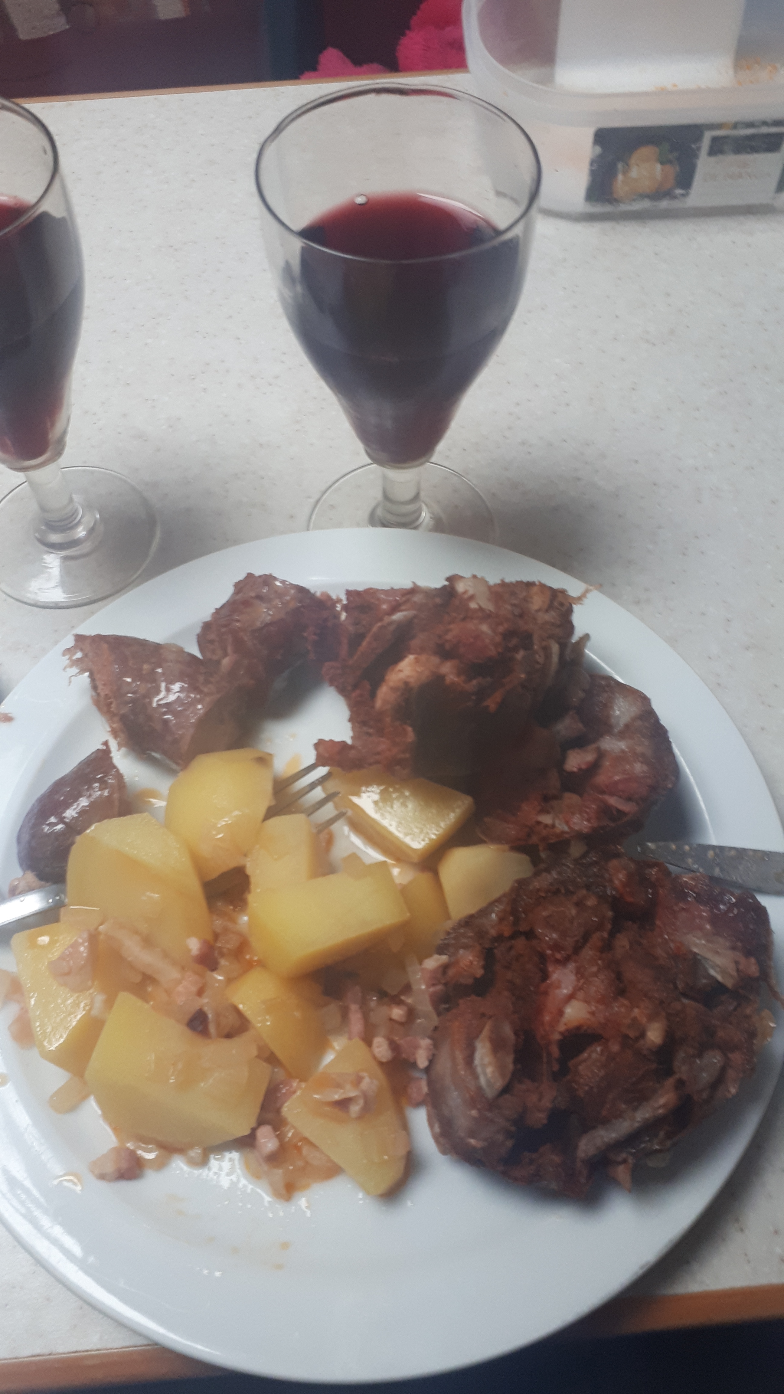 mouton cuit au vin rouge et des épices dans une cocote en terre dans un four à bois pendant plusieurs heures, servit avec des légumes et des pommes de terre.