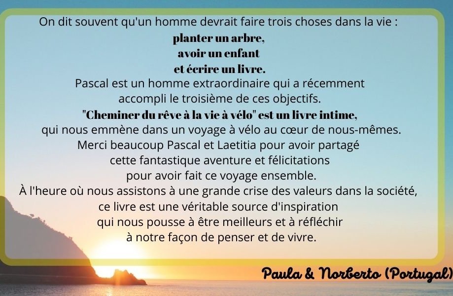 Une découverte captivante du nord au sud de l’Europe, à travers les saisons, les sourires des habitants, les poètes, la grande histoire, les légendes locales, les paysages majestueux, les aléas climatiques, la vie sauvage, les animaux de rencontre, les humbles fleurs des champs… Partez pour un road-movie sur papier, plein d’images somptueuses et de souvenirs attachants. Pas seulement la chronique d’un couple de cyclistes, mais aussi une étonnante introspection sur le temps qui passe, la grandeur et la misère humaine, la beauté du monde à préserver, sur la vie tout court…